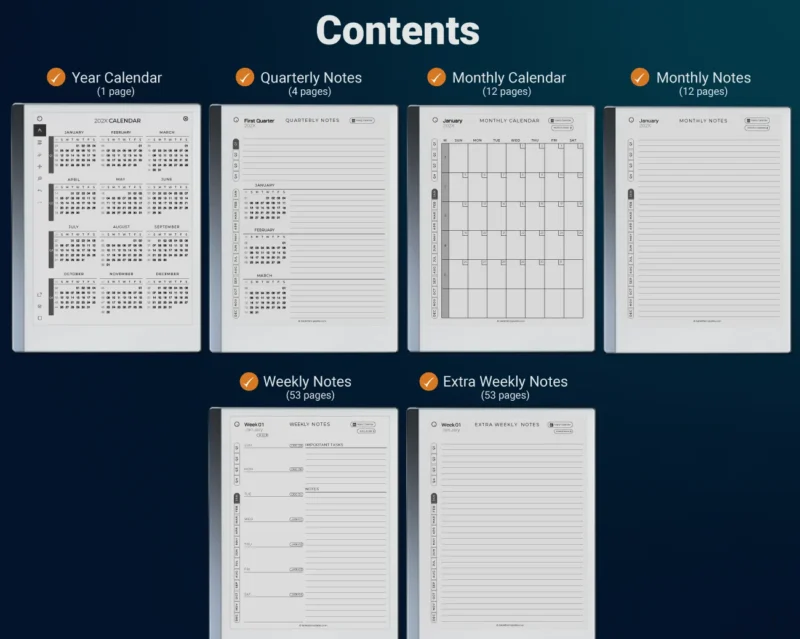 You will receive our designed for reMarkable 2 Weekly Planner 2026 + 2027. Each document has a total of 136 fully hyperlinked pages, containing: