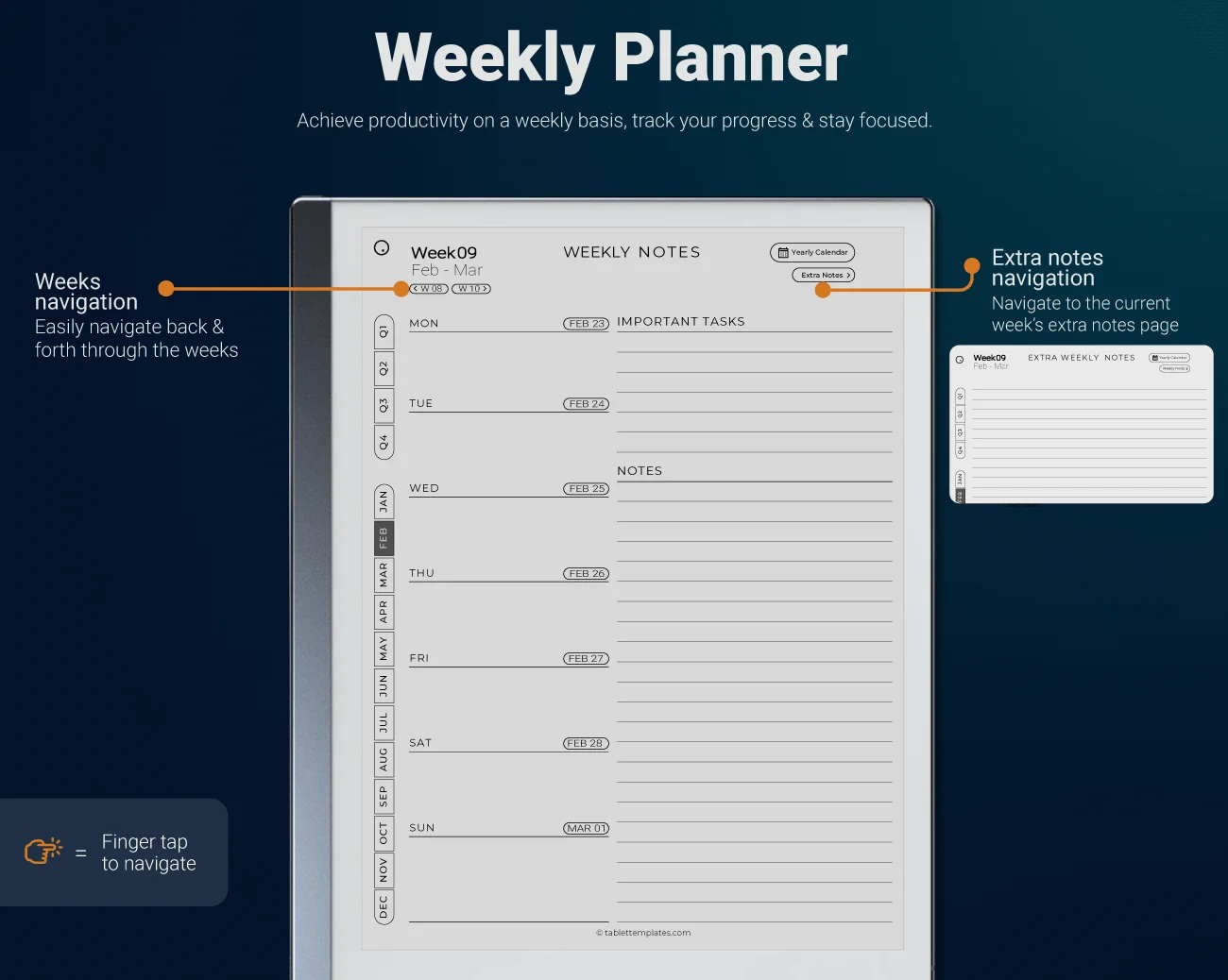 Achieve productivity on a weekly basis, track your progress, and stay focused with our thoughtfully designed for reMarkable 2 Weekly Planner.